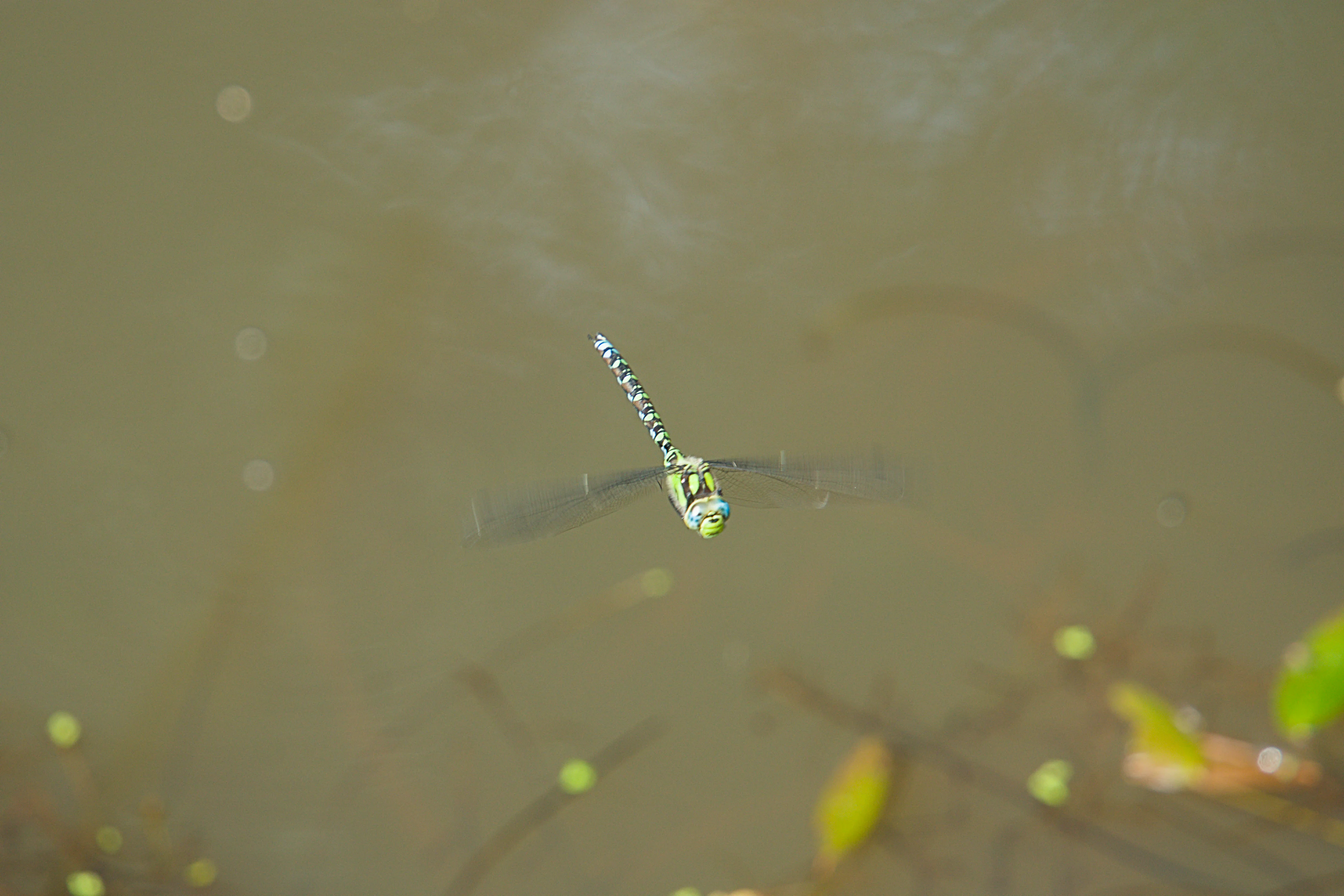 Caught mid-flight, this stunning dragonfly hovers gracefully above what looks like the calm surface of a pond or a serene natural backdrop. Its intricate green and blue head, combined with its distinctive patterned body of black, white, and emerald green, really pops against the soft, muted tones of the background. The rapid beat of its wings creates a beautiful blur, showcasing the incredible speed and agility of these aerial acrobats. It's a fleeting moment of nature's beauty, perfectly captured!