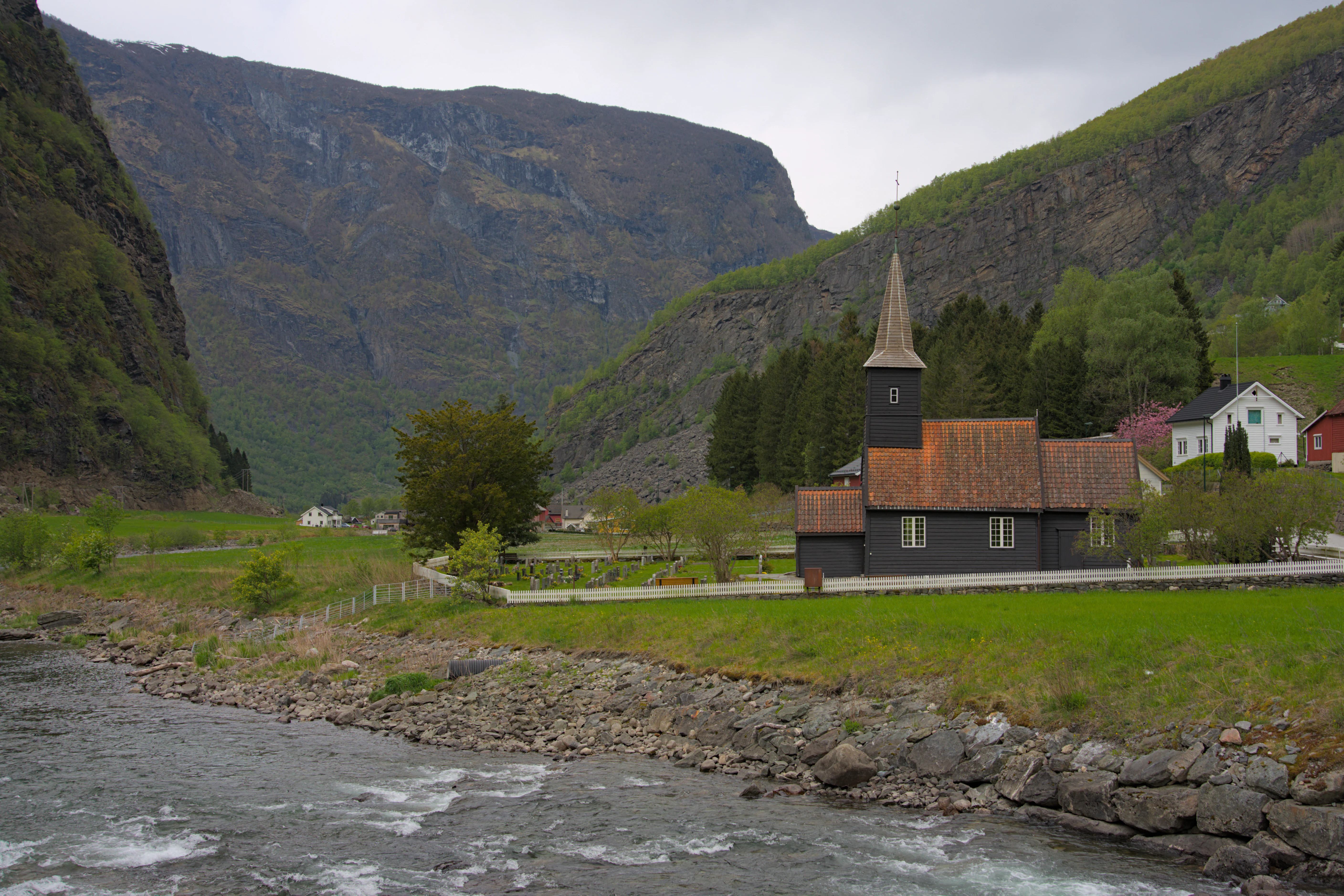 An enchanting view captures a traditional wooden church nestled in a picturesque Norwegian valley. The dark-painted church features a striking, pointed spire and a vibrant orange-tiled roof, its white-framed windows contrasting beautifully with the dark timber. It stands gracefully on a verdant grassy bank, bordered by a classic white picket fence, with a serene cemetery visible beside it. In the foreground, a clear, rapid river flows over a rocky bed, adding a dynamic element to the tranquil scene. The backdrop is dominated by the imposing, steep mountains that define the dramatic Norwegian landscape, their lower slopes covered in fresh spring greenery. Scattered houses dot the hillsides, adding to the rural charm under an overcast sky, creating a quintessential Nordic vista of peace and natural grandeur.