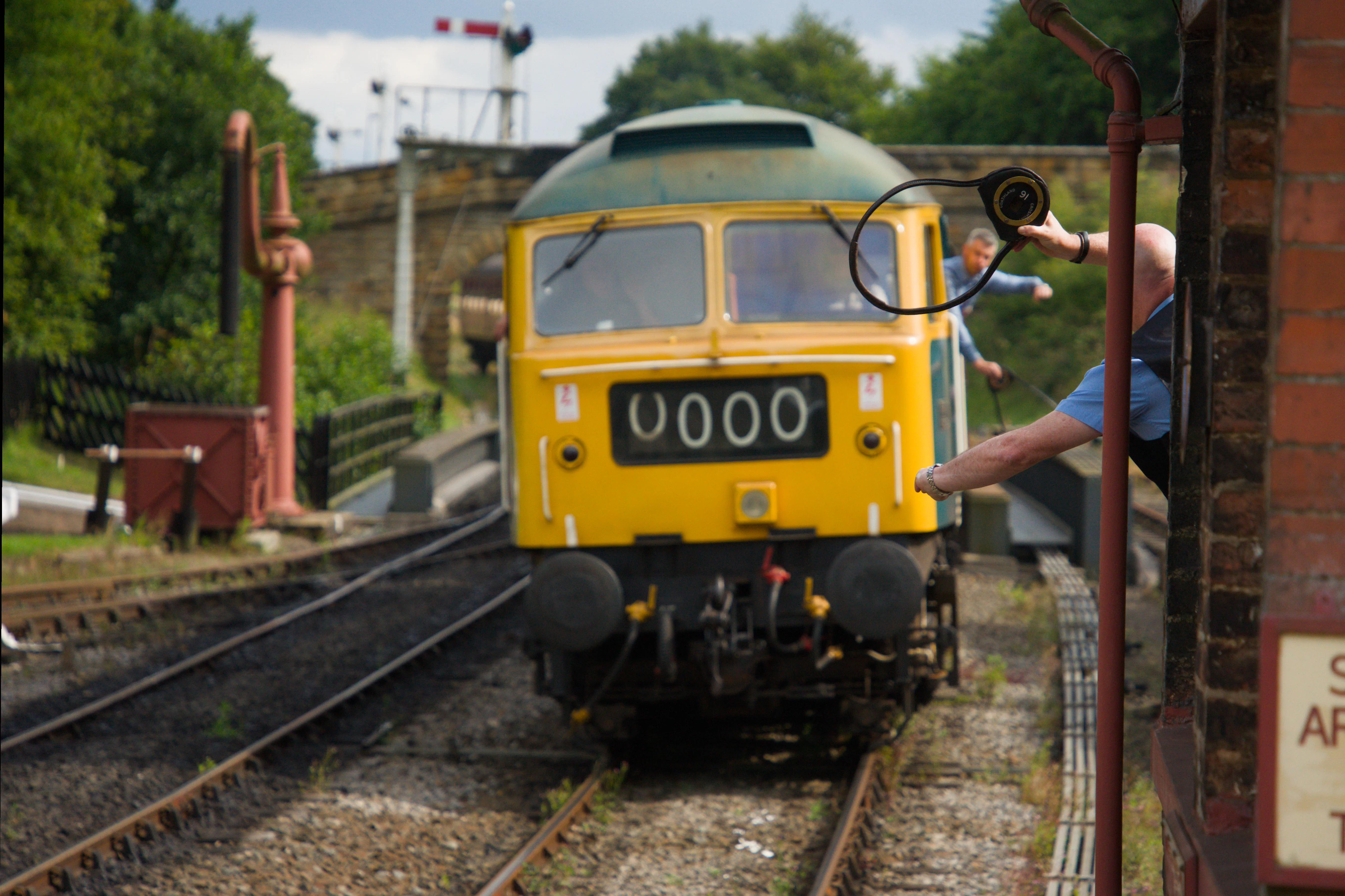 A classic railway moment captured! Here, a vibrant yellow and green diesel locomotive approaches a signal box or station, and a crucial train staff (or token) exchange is underway. This isn't just a simple handover; it's a fundamental safety procedure for single-line railway sections. The physical token acts as the authority for the driver to enter and occupy that section of track, ensuring that only one train can be on the line at any given time. It’s a wonderful nod to the meticulous operations and rich history of the railways, keeping traditions alive and tracks safe! The semaphore signal in the background adds to the timeless charm of this scene.