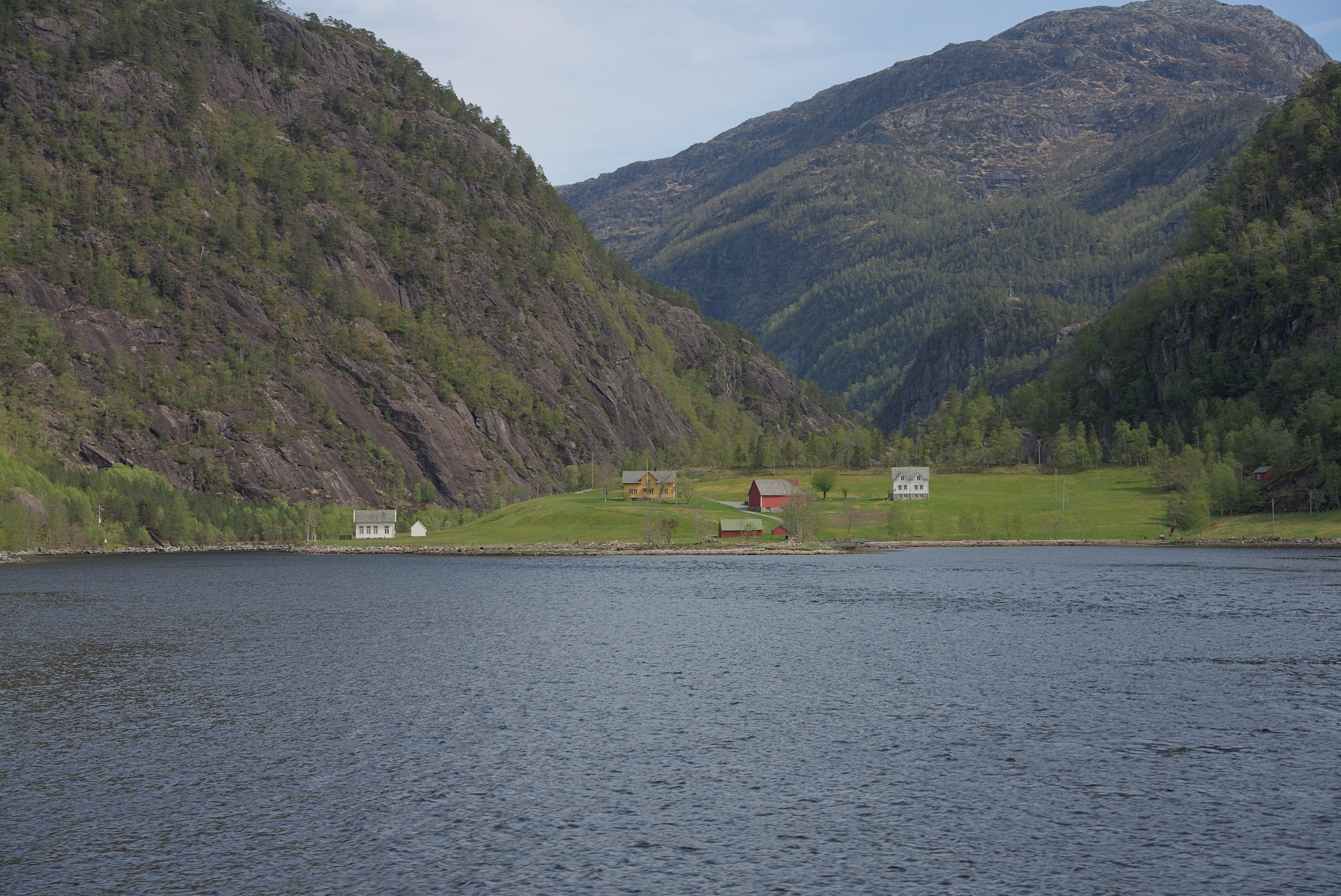 A serene landscape view captures a calm body of water, likely a fjord or large lake, stretching across the foreground. On the opposite bank, a verdant green hillside slopes gently upwards, dotted with several charming, traditional-style houses. Prominently featured are a yellow house with a gabled roof, a red barn, a white multi-story house, and a smaller white outbuilding, all nestled amidst the vibrant greenery. Behind these dwellings, imposing, steep mountains rise dramatically, their rocky surfaces interspersed with patches of lush green trees, suggesting a dense forestation typical of Scandinavian landscapes. The sky above is a soft, overcast blue, contributing to the tranquil atmosphere of this remote and picturesque settlement.