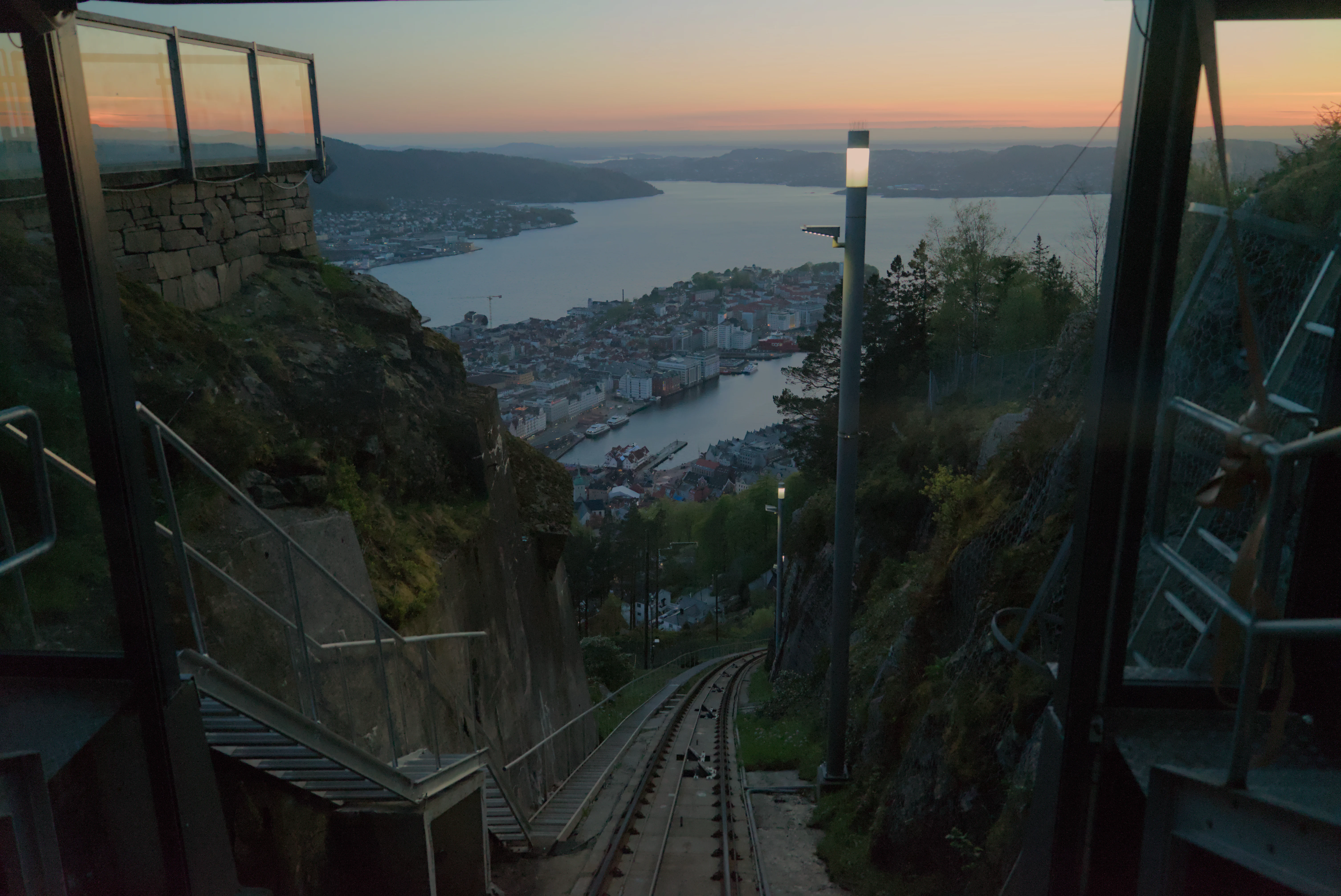 A breathtaking view captured from the vantage point of the Fløibanen funicular in Bergen, Norway, as it descends towards the city below. The image depicts a serene twilight scene, with the sky showcasing a gradient of soft oranges and pinks, hinting at either a late sunset or early sunrise. Below, the city of Bergen stretches along the tranquil waters of the fjord, with buildings illuminated by the soft evening light. The funicular tracks, flanked by rocky, moss-covered slopes and some sparse vegetation, guide the eye downwards, emphasizing the steep incline. Structural elements like safety railings, stone walls, and a modern streetlamp are visible in the foreground, framing the panoramic vista. The reflection of the sky's warm colors is subtly visible on the glass barriers to the left, adding to the picturesque ambiance.