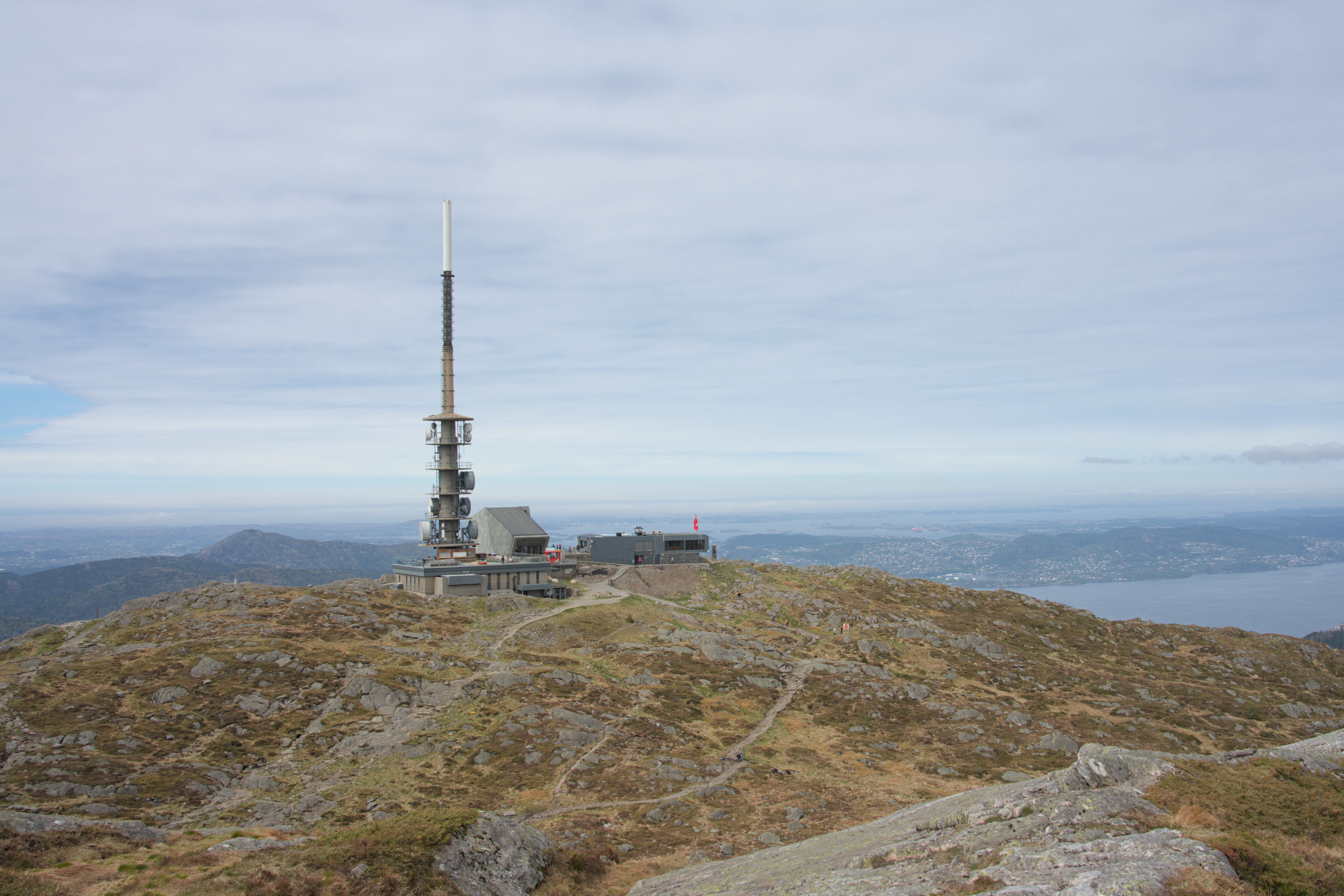 A panoramic view from the summit of Mount Ulriken in Bergen, Norway, reveals the prominent telecommunications tower and a modern structure, likely a restaurant or observation deck, situated atop the rugged, rocky landscape. The foreground features a winding dirt path meandering through sparse, brownish-green vegetation and numerous grey boulders, indicating a popular hiking trail. In the background, a vast expanse of water, possibly a fjord or the open sea, stretches towards the horizon, bordered by distant landmasses and a sprawling cityscape, all under a bright, overcast sky.