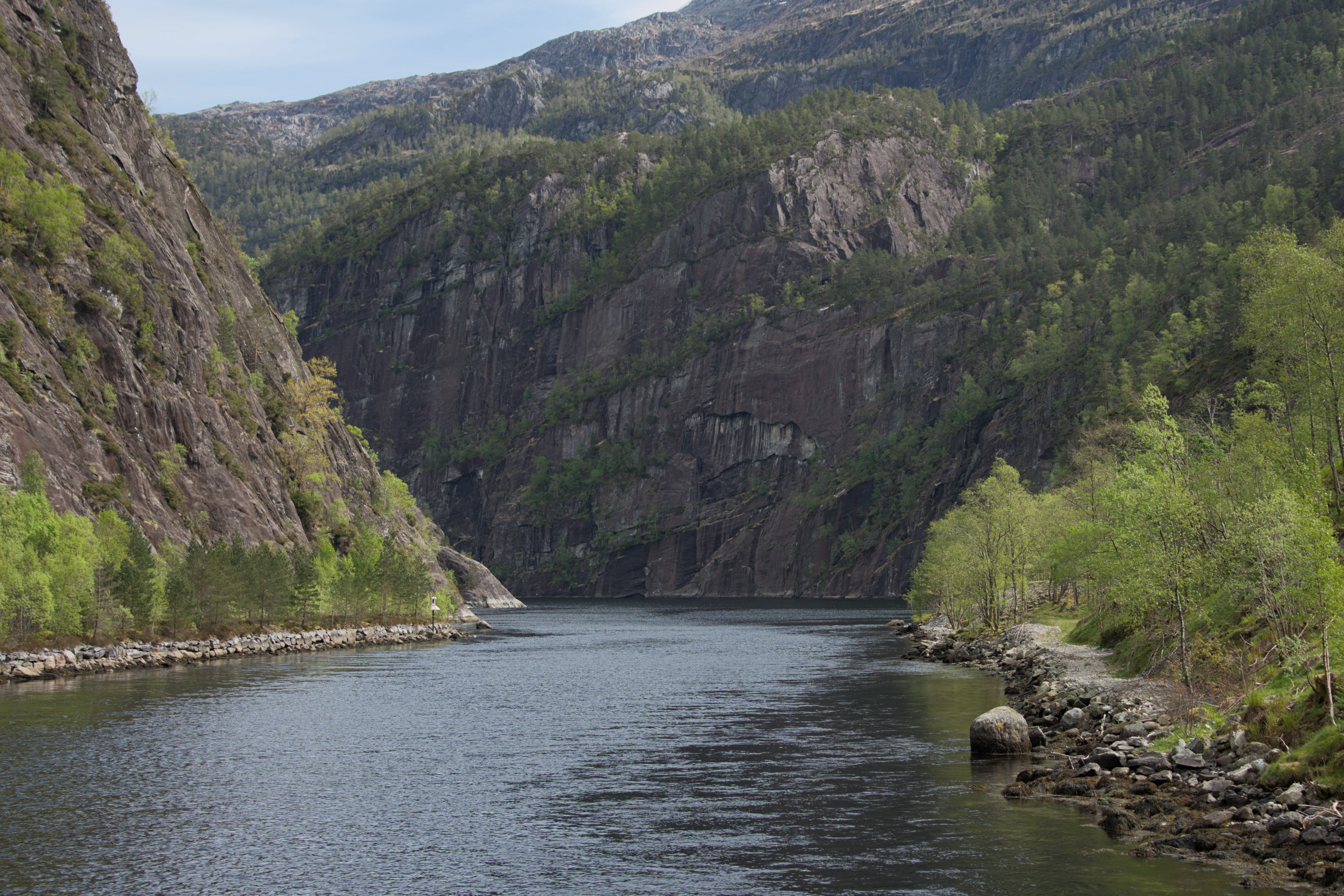 This captivating image showcases a serene waterway, likely a fjord or a deep river, carving its path between towering, rugged mountains. The formidable rock faces on both sides are partially adorned with vibrant green foliage, suggesting a lush, verdant environment. The calm, dark blue water reflects the muted light from above, adding to the tranquil atmosphere. Along the edges of the waterway, rocky shores provide a natural boundary, further enhancing the untouched beauty of the landscape. The scene evokes a sense of awe at the majestic scale of nature, characteristic of the pristine and dramatic natural beauty found in regions like Scandinavia.