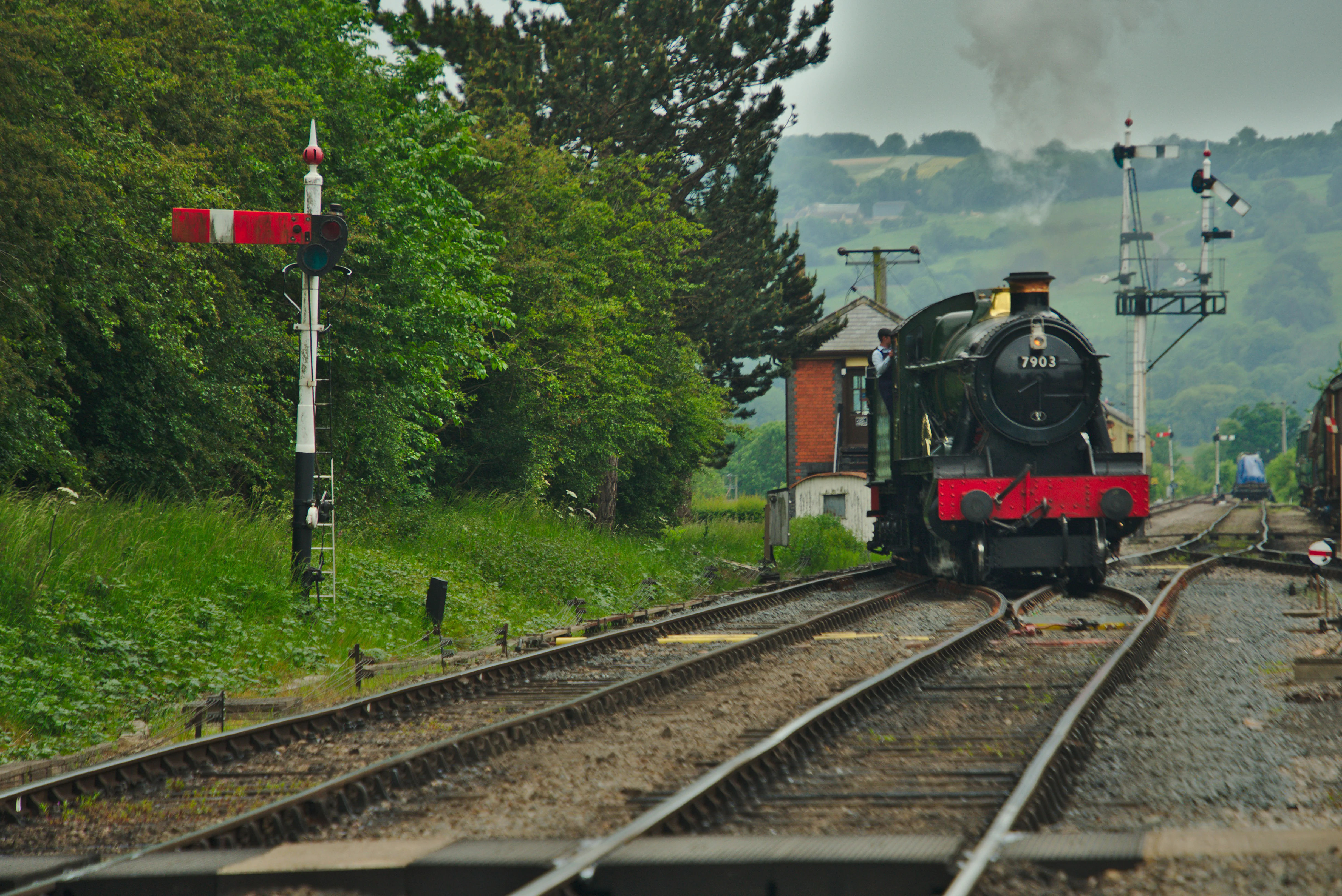 A classic black steam locomotive, identified by the number 7903 on its front, is captured on railway tracks amidst a verdant landscape. The train, emitting a plume of steam, appears to be either approaching or stationary, with a crew member visible in the cab. To the left, a traditional red and white semaphore signal stands prominently, its arm indicating a clear or stopped line. Further down the tracks on the right, additional semaphore signals and railway infrastructure are visible, leading into the distance. Behind the train, a quaint brick signal box adds to the historic railway ambiance. The scene is set against a backdrop of lush green trees and gently rolling hills under what appears to be an overcast sky, evoking the nostalgic charm of a heritage railway line.