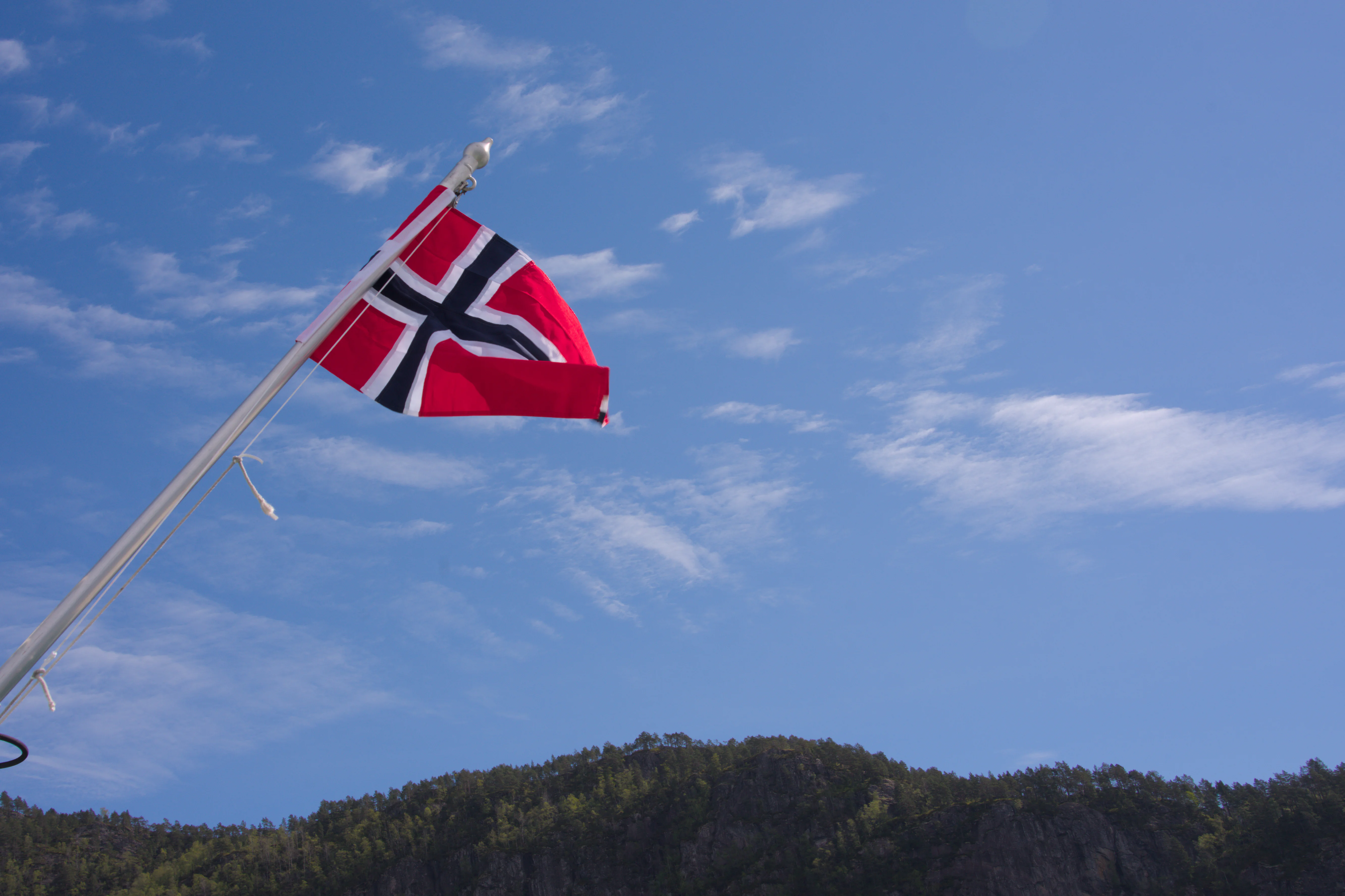 The vibrant red, white, and blue flag of Norway, featuring its distinctive Nordic cross design, flutters proudly on a mast against a clear, expansive blue sky. Wispy cirrus clouds are scattered across the upper portion of the sky, adding depth and texture to the bright atmosphere. In the lower part of the frame, the dark green canopy of a densely forested mountain or cliff provides a striking natural backdrop, hinting at the rugged and scenic landscapes often found in Norway, such as its famous fjords. The sunlight illuminates the flag's colors, making them stand out vividly against the serene blue backdrop.