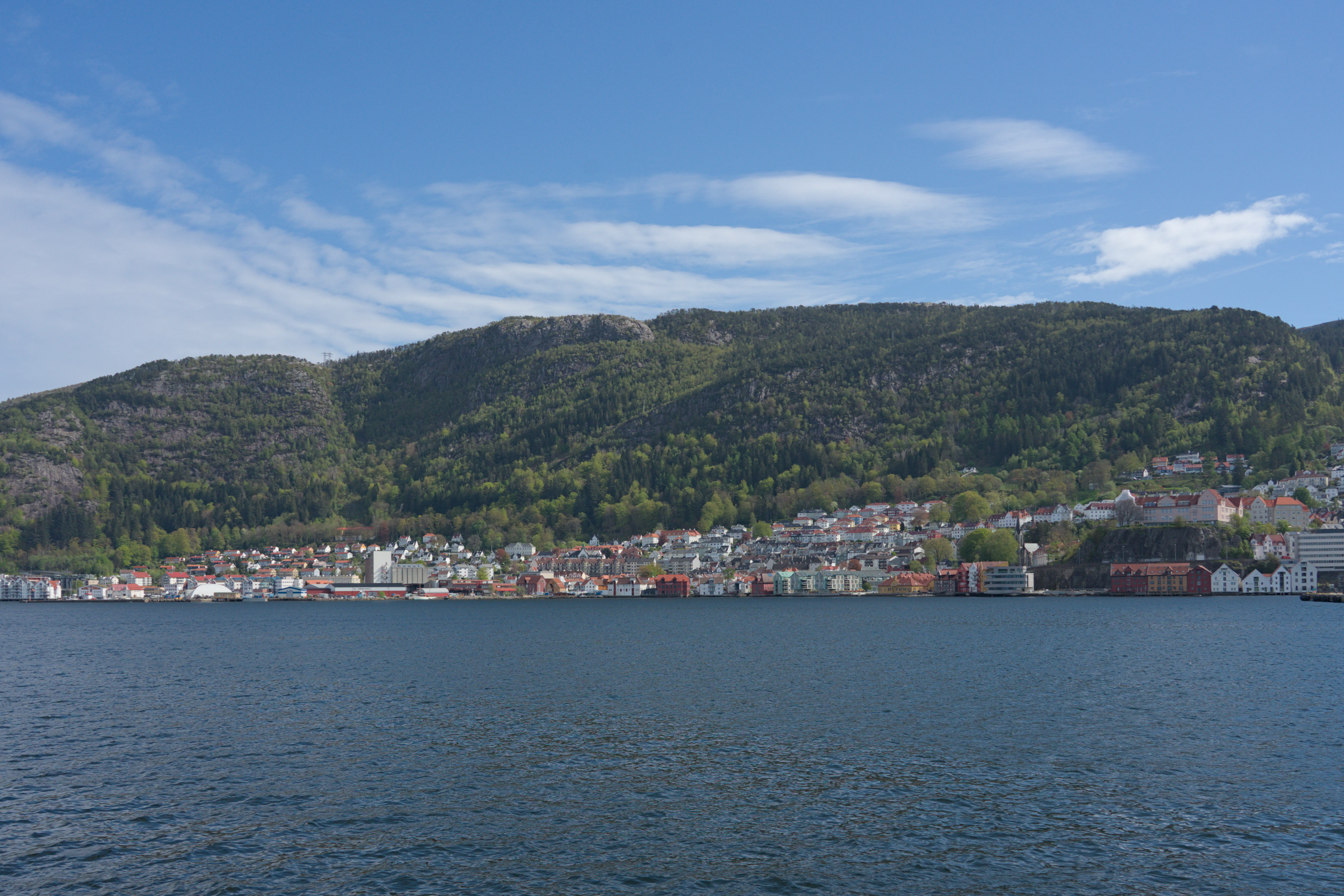 A picturesque coastal town is beautifully framed by a large, verdant mountain rising directly behind it, with calm blue waters stretching in the foreground. The town's buildings, a charming mix of traditional and more modern structures, display a variety of colors, from deep reds and blues to whites and browns, as they line the waterfront and ascend the lower slopes of the lush, tree-covered mountain. Rocky outcrops are visible on the mountain's upper sections, adding texture to the natural landscape. The sky above is a vibrant blue, dotted with soft, wispy white clouds, suggesting a clear and pleasant day. The foreground features the serene, rippling surface of the water, which reflects the bright sky, creating a sense of tranquility and depth. This panoramic view captures the harmonious blend of urban development and dramatic natural scenery, characteristic of many coastal regions.